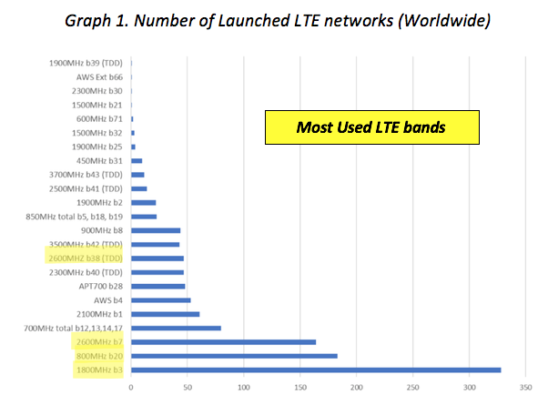 The licensed spectrum includes the commercial mobile spectrum bands for 4G LTE networks with access depending upon local frequency regulations. Each country has different licensing rules and regulations. Furthermore, according to the report from GSA (Global mobile Suppliers Association) in April 2019, LTE networks have been deployed in 38 licensed frequency bands worldwide. The four most-used bands are 1800 MHz (band 3), 800 MHz (band 20), 2600 MHz (band 7), and 700 MHz.